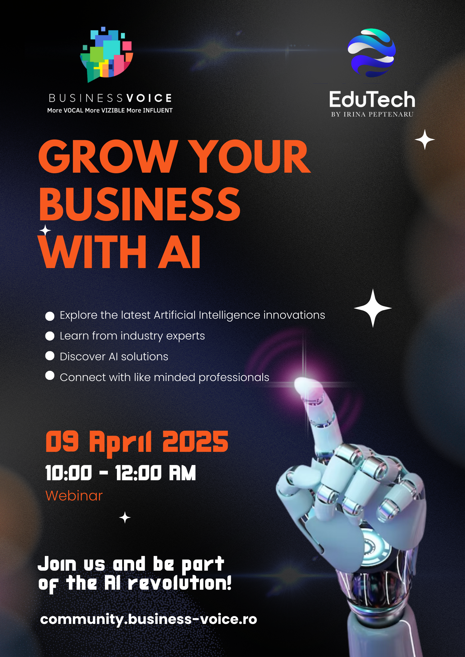 Această inițiativă reprezintă o colaborare între BusinessVoice, EduTech by Irina Peptenaru și Code24, parteneri de încredere în transformarea digitală.