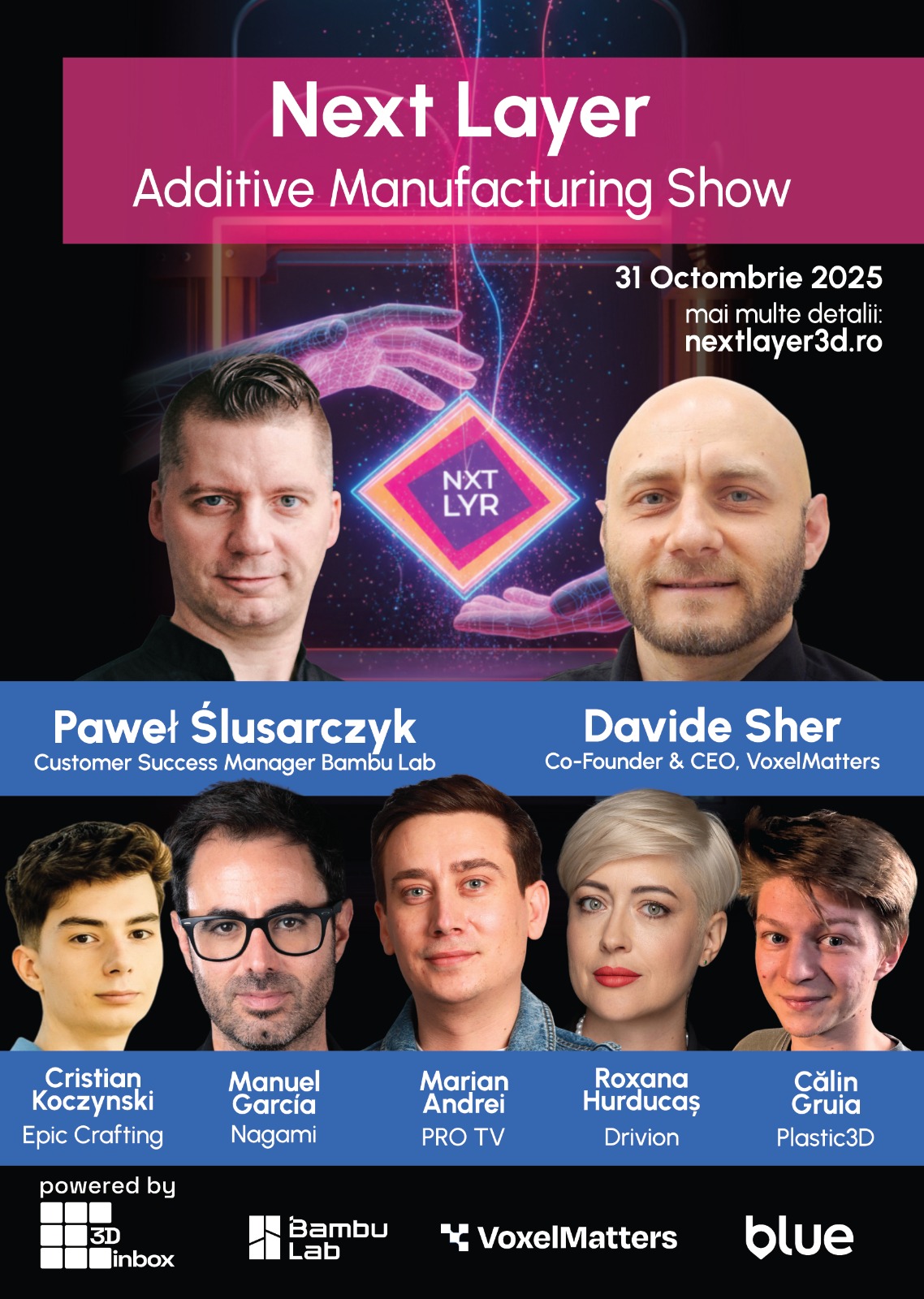 Organizat de compania 3dinbox.ro, cu sprijinul partenerului media VoxelMatters și al partenerului de mobilitate Blue, evenimentul va prilejui participanților întâlnirea cu nume consacrate la nivel mondial, precum Davide Sher (Italia), Co-fondator și CEO al VoxelMatters, Paweł Ślusarczyk (Polonia), Bambu Lab sau Manuel Jiménez García (Spania), Co-fondator Nagami. Lor li se alătură voci relevante din România, printre care se numără Călin Gruia (Plastic3D), Alfred Cristian Koczynski (Epic Crafting) și Roxana Hurducaș, expert în strategie de brand.