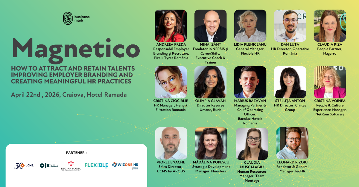 Lideri ai departamentelor de Resurse Umane, experți în comunicare și decidenți de business sunt invitați, pe 22 aprilie 2026, la Craiova, la o nouă ediție a evenimentului „MAGNETICO. How to attract and retain talents improving employer branding and creating meaningful HR practices”.